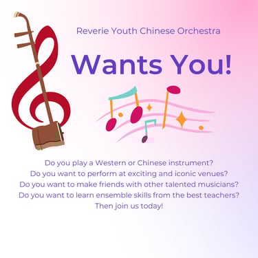 Reverie Youth Chinese Orchestra 築夢青少年國樂團 is an award winning traditional Chinese instrument youth orchestra based in Irvine, California. Our extensive repertoire is an exciting crossover of Chinese and Western classic, folk, and pop music to delight audiences of all backgrounds, ages, and tastes. We have performed at concert halls, theme parks, research and educational institutions, libraries, museums, and festivals throughout California and have been featured on local and international media.